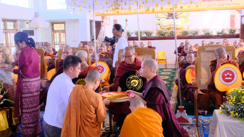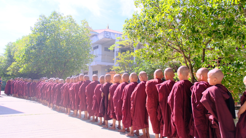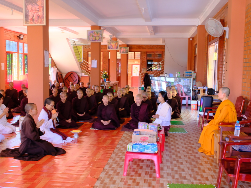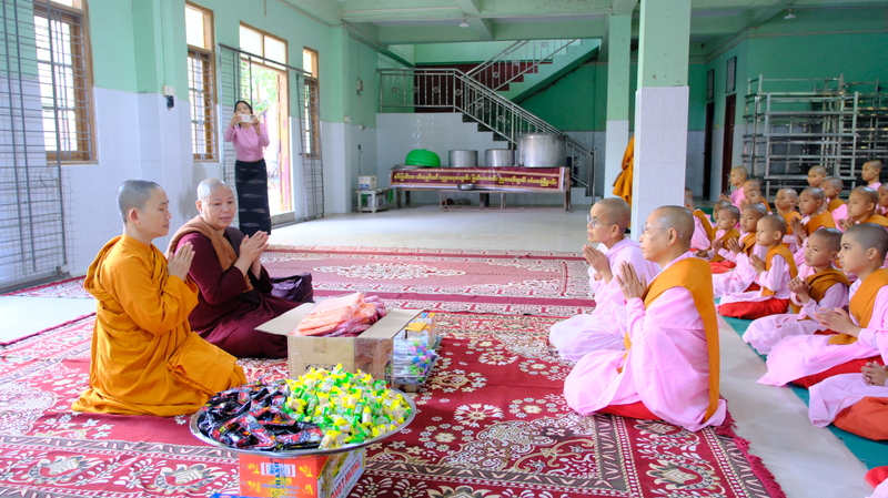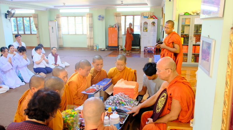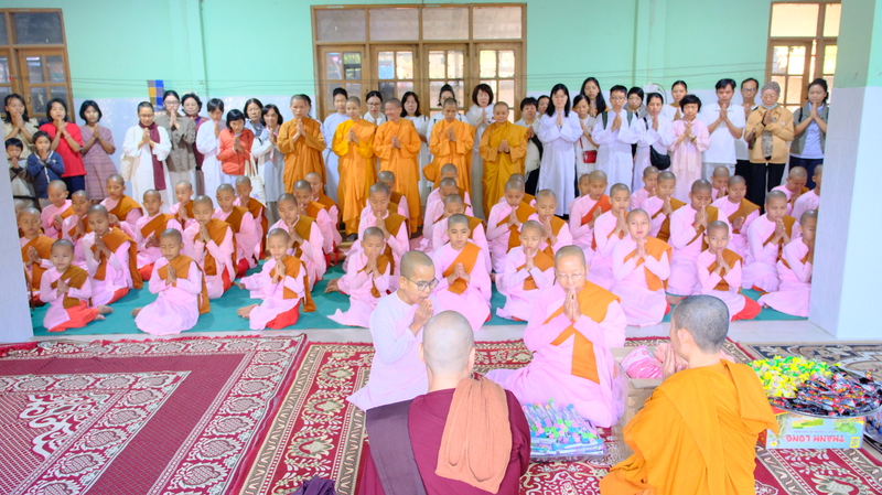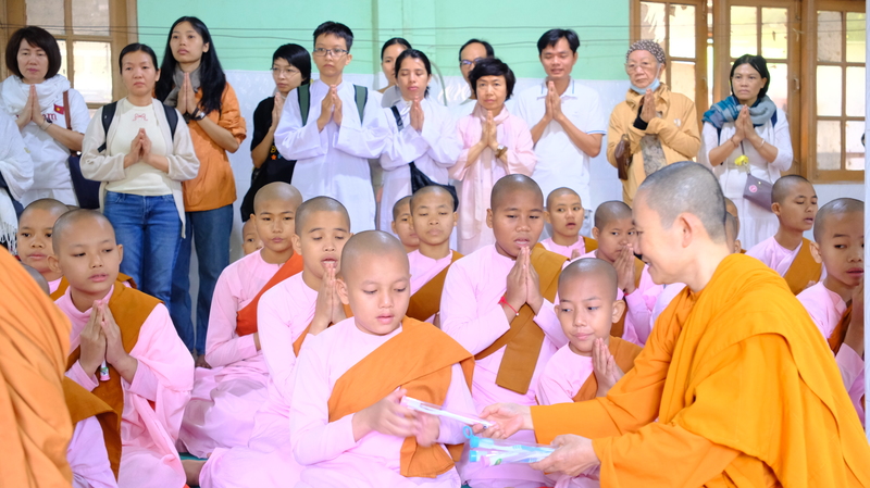 Chặng đầu của hành trình, đoàn khởi tâm đến Mahavihara Hlegu – một đại tu viện nơi hơn một nghìn hai trăm vị Tăng ngày đêm sống đời phạm hạnh. Khung cảnh chư Tăng tu học trang nghiêm, tiếng kinh vọng nhẹ như thoảng vào tâm, làm ai nấy đều tự nhiên cúi mình trong sự kính phục thầm lặng. Những tặng phẩm giản dị – khăn, bút, bàn chải, thực phẩm và thuốc men – được dâng lên với tất cả tấm lòng  hộ trì và mong mỏi góp chút duyên lành cho đời sống tu học nơi đây.